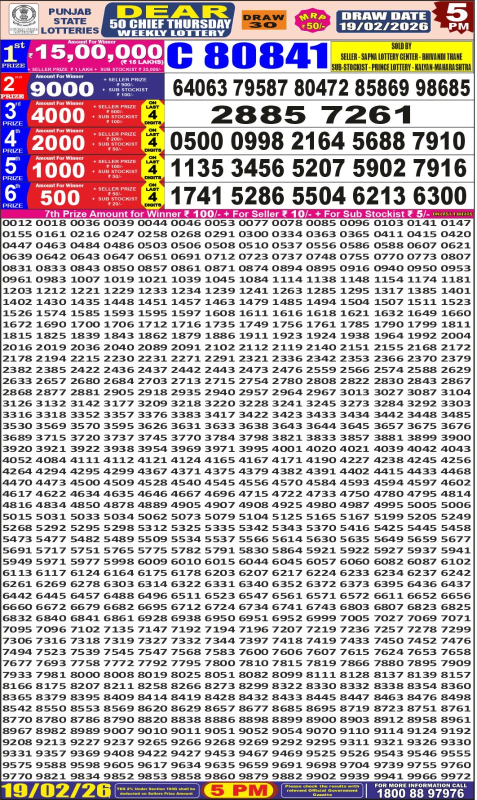 Punjab State Lottery Dear 50 Result 5PM 19/02/2026