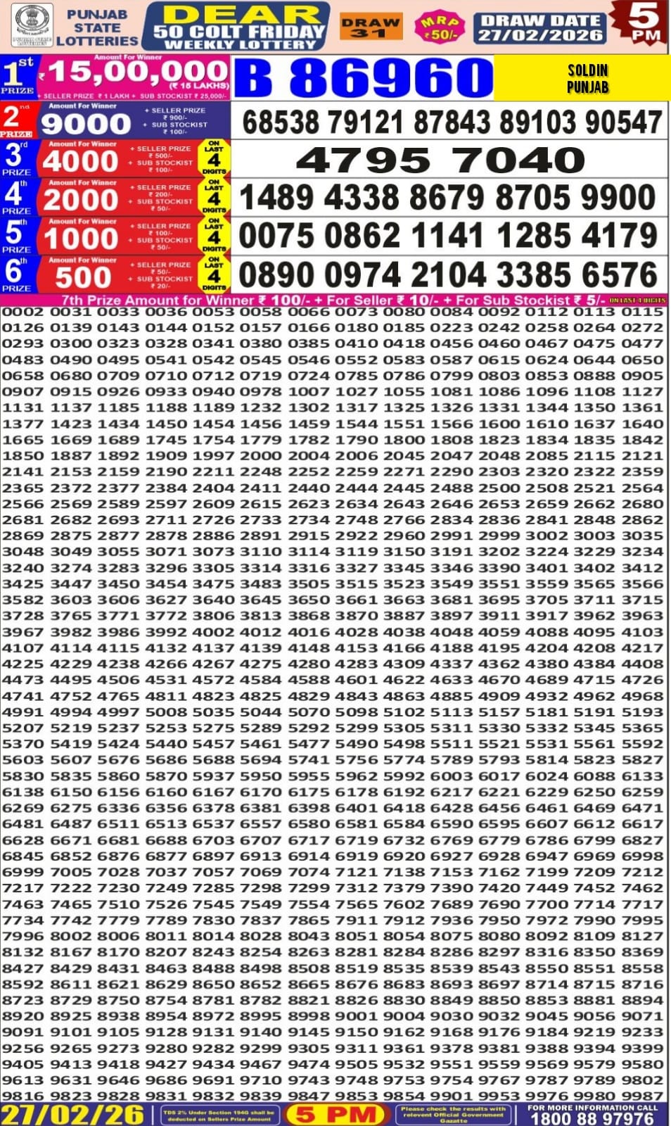 Punjab State Lottery Dear 50 Result 5PM 27/02/2026