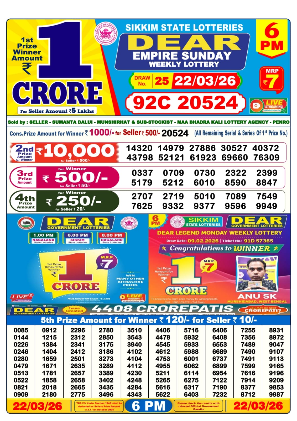 Lottery Sambad Lottery Result 1PM 22/03/2026
