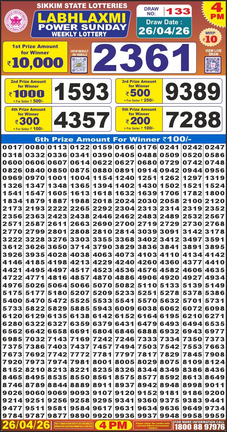 Labh Laxmi Lottery 4PM Result 26/04/2026