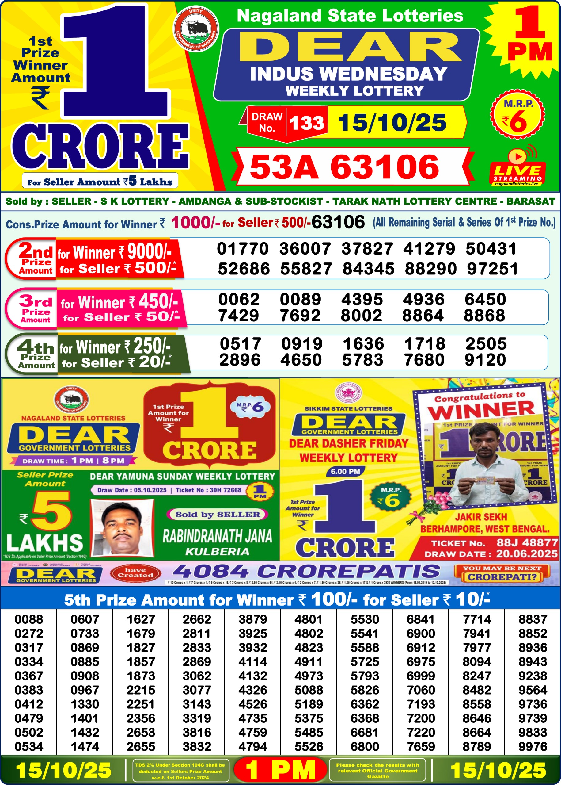 Dear Lottery Sambad 1:00 PM Result Live 15/10/25
