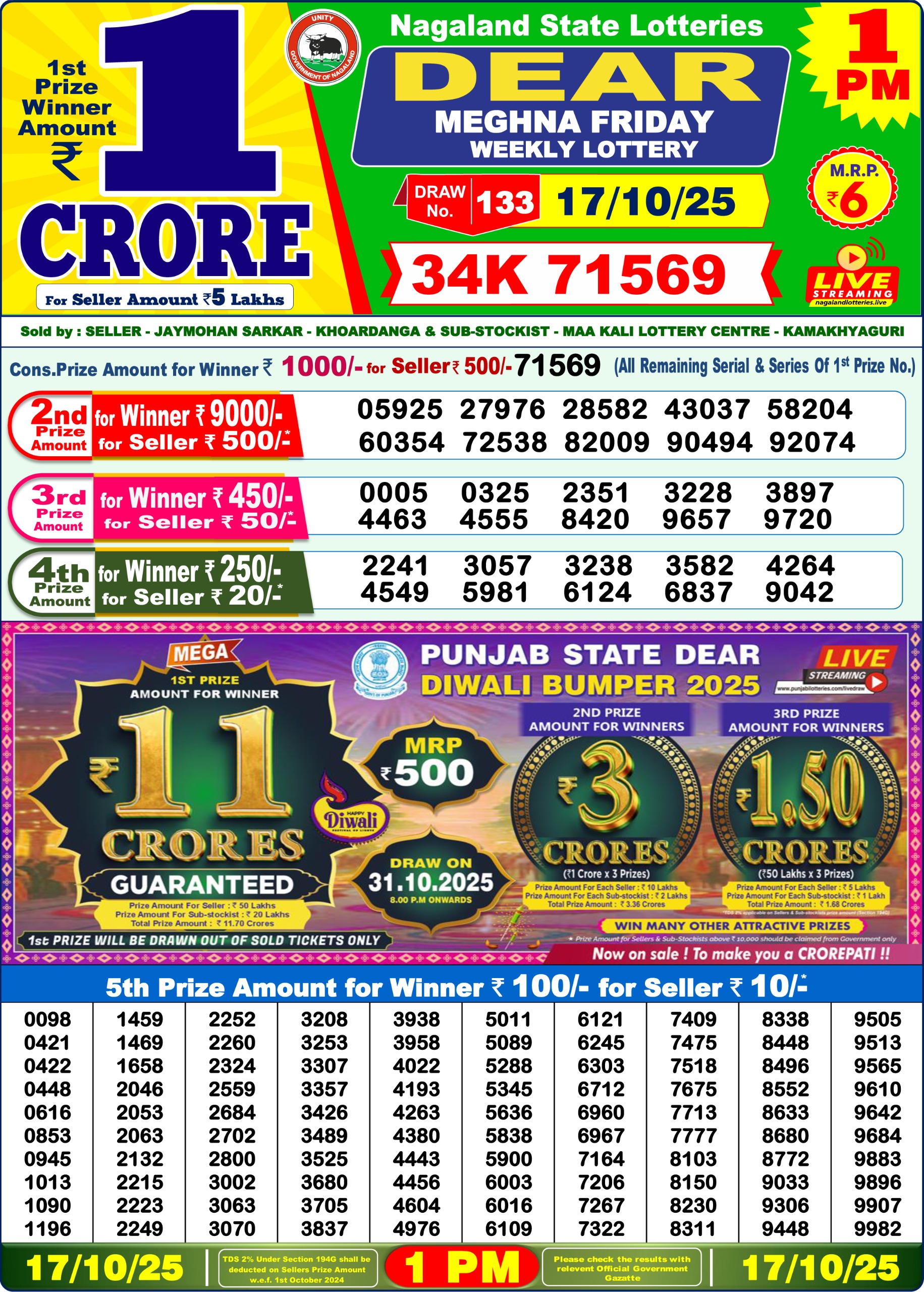 Dear Lottery Sambad 1:00 PM Result Live 17/10/25