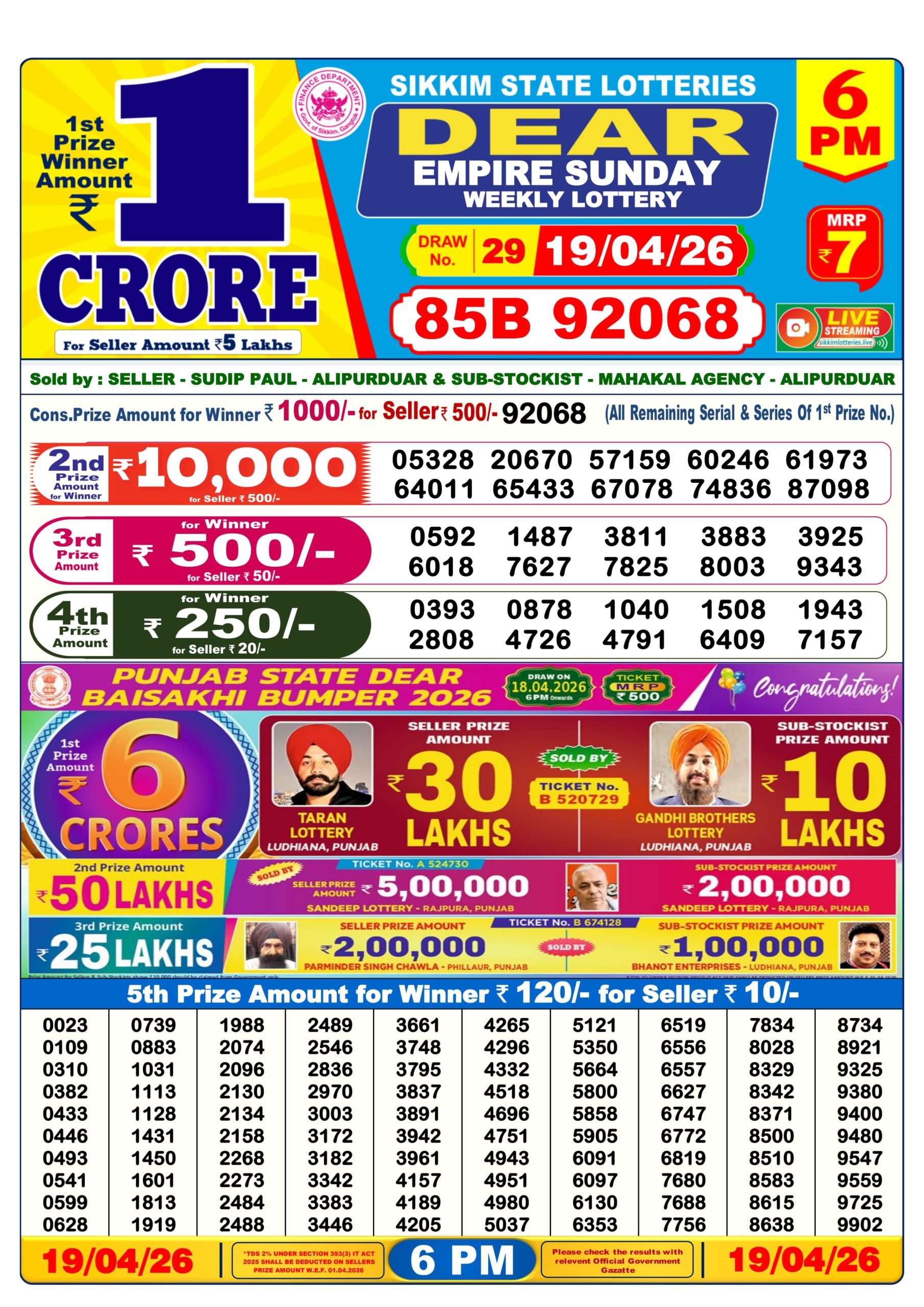 Lottery Sambad Result 6PM 19/04/2026