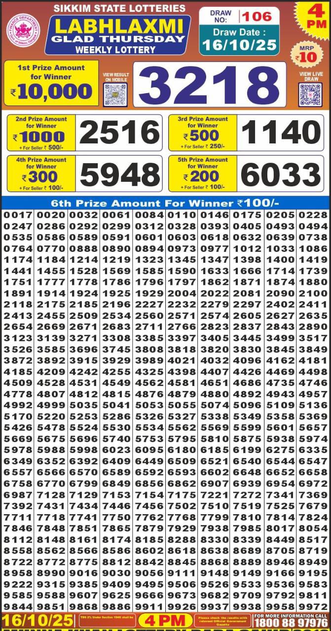 Labh Laxmi 4:00 PM Lottery Result Today 16/10/25