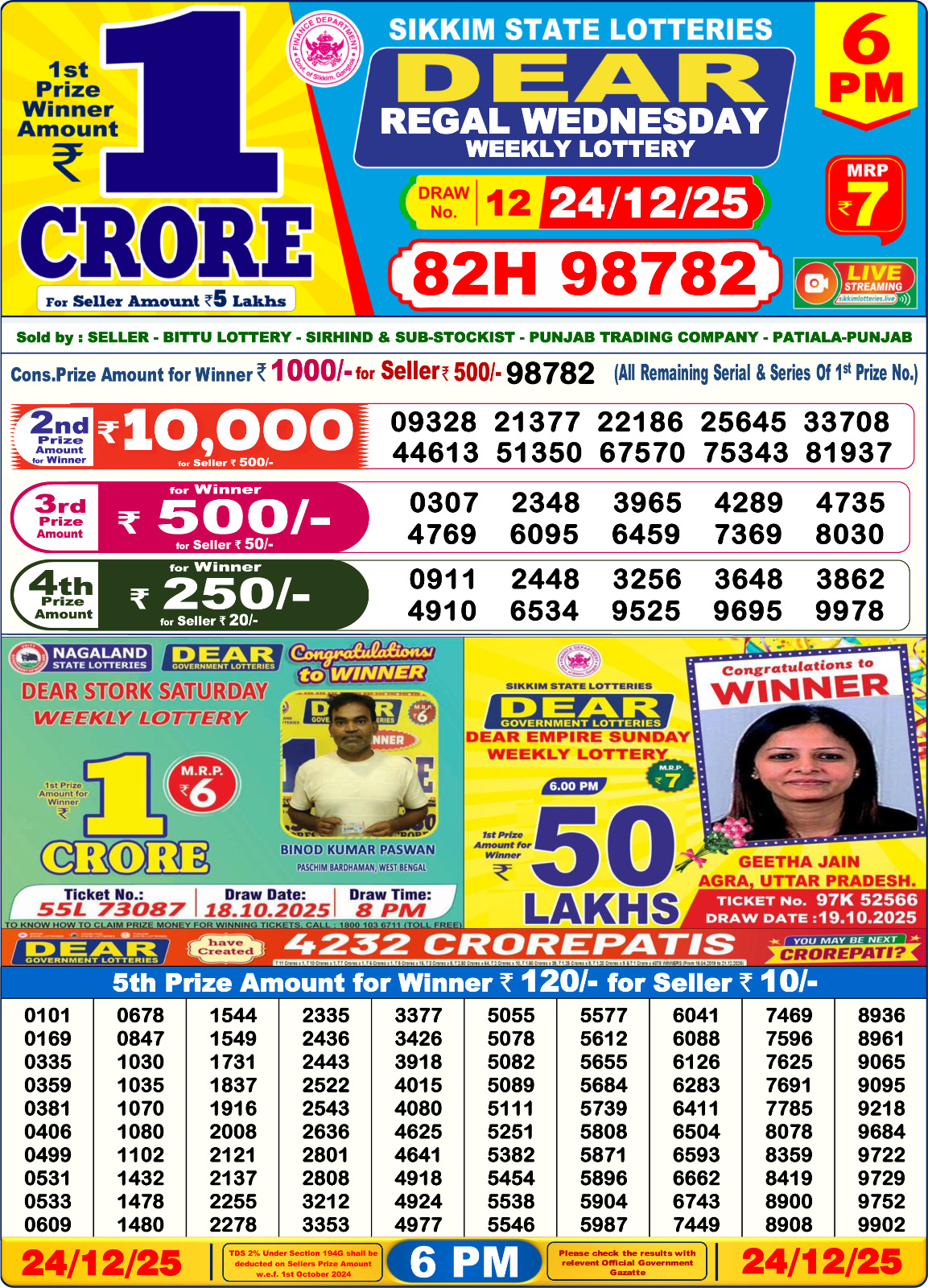 Dear Lottery 6 PM Result 24-12-2025 (Lottery Sambad Update)