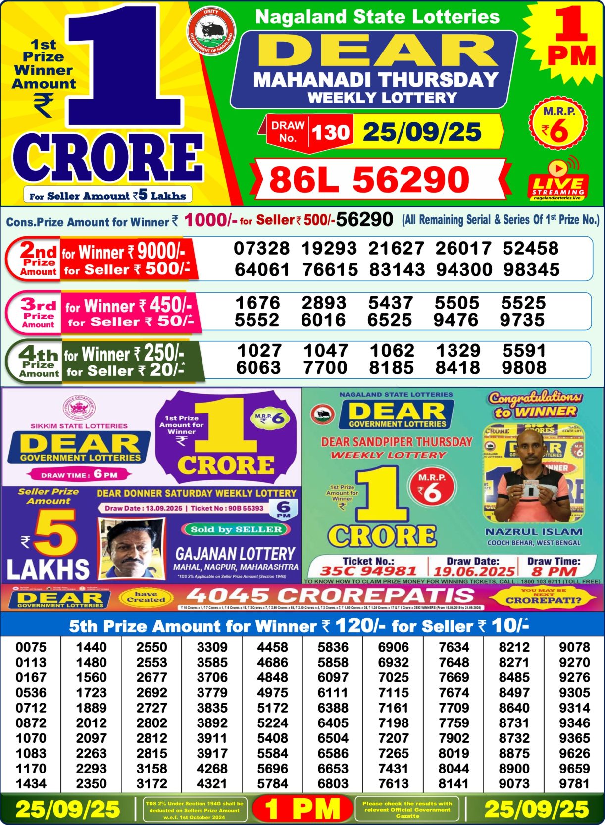 Here are the live results for the Dear Lottery Sambad 1:00 PM draw on 25-09-2025 . This popular afternoon draw, organized by the Nagaland State Lotteries, offers a first prize of ₹1 Crore. Check your ticket number against the winning numbers listed below.