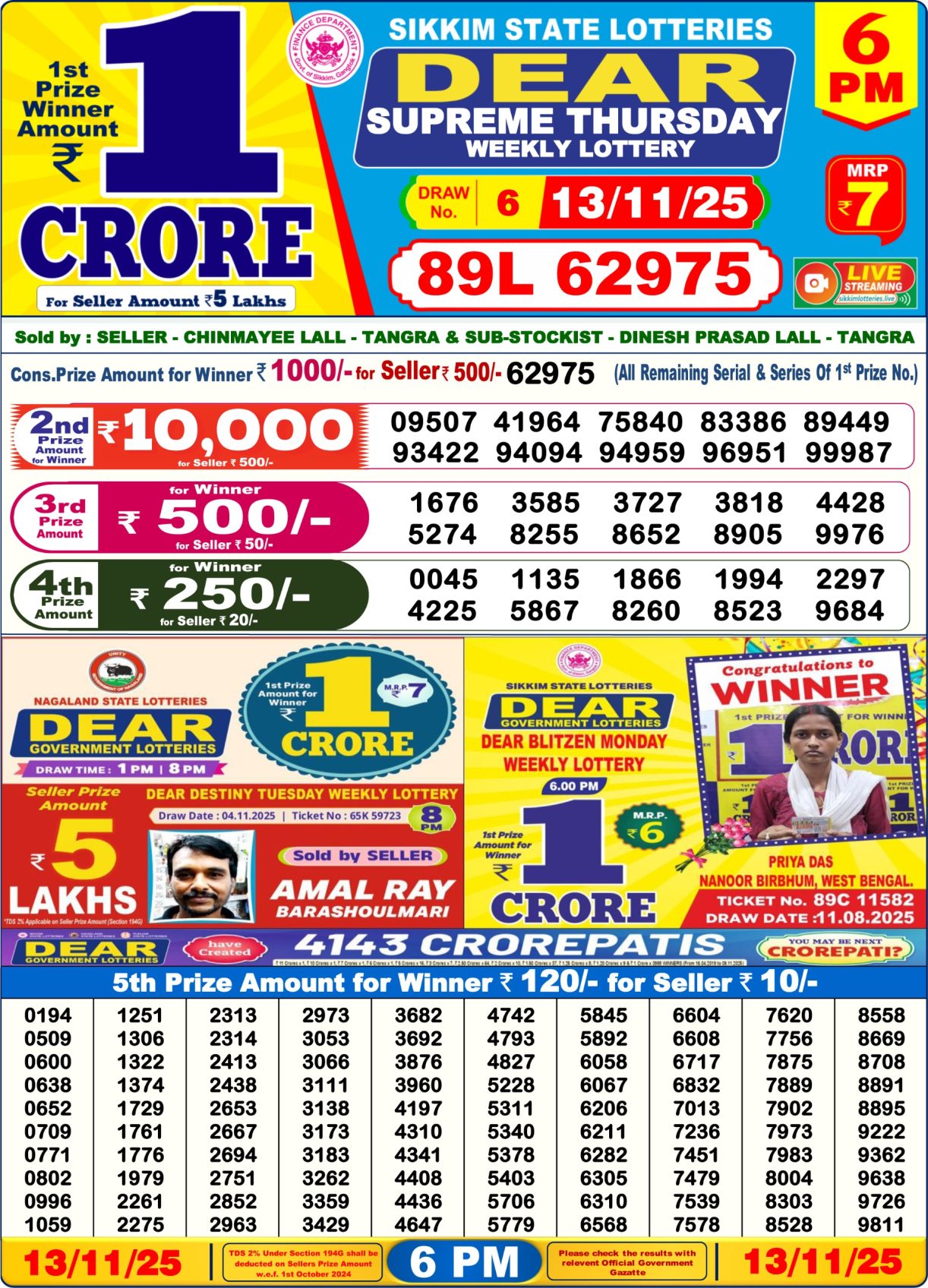 The 6PM draw—commonly referred to as the “Dear Day Lottery”—is the second of three daily draws and this one draw is officially issued by the Sikkim State Lottery. It falls right in the middle of the Lottery Sambad schedule, between the 1PM Morning and the 8PM Night draws which are conducted by Nagaland State. As of Thursday, 13-11-2025, thousands of players are tuned in to see if today’s result will bring in good fortune.