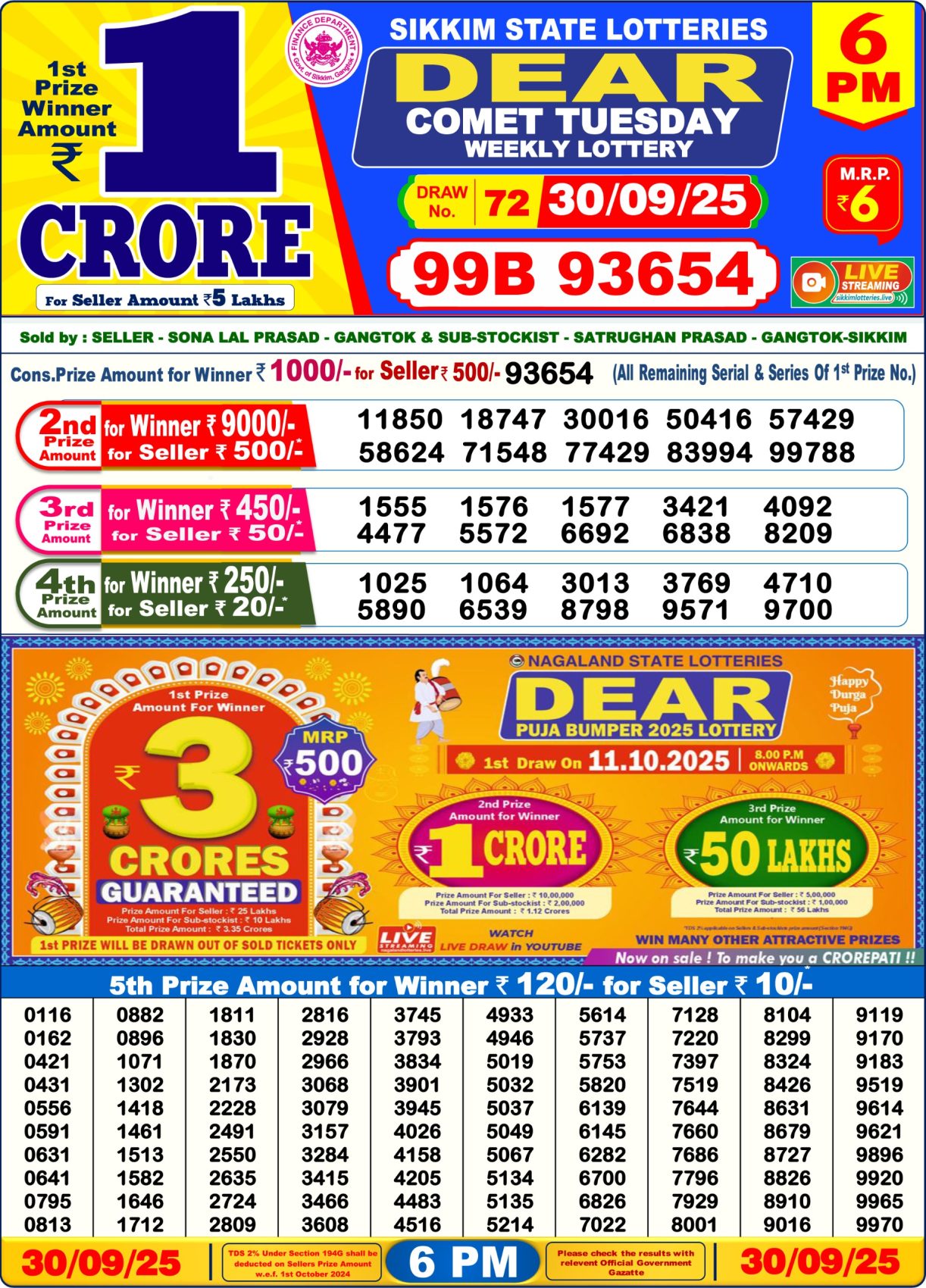 The 6PM draw—commonly referred to as the “Dear Day Lottery”—is the second of three daily draws and this one draw is officially issued by the Sikkim State Lottery. It falls right in the middle of the Lottery Sambad schedule, between the 1PM Morning and the 8PM Night draws which are conducted by Nagaland State. As of Tuesday, 30-09-2025, thousands of players are tuned in to see if today’s result will bring in good fortune.