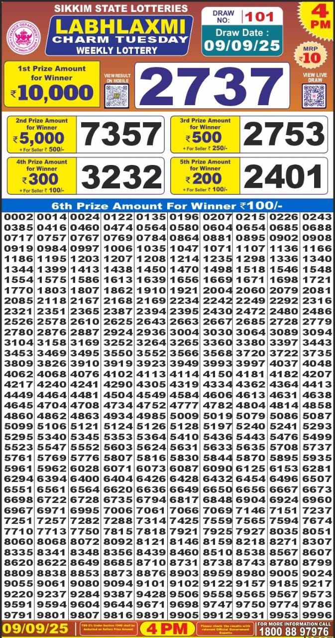 Labh Laxmi 4:00 PM Lottery Result Today 09/09/25