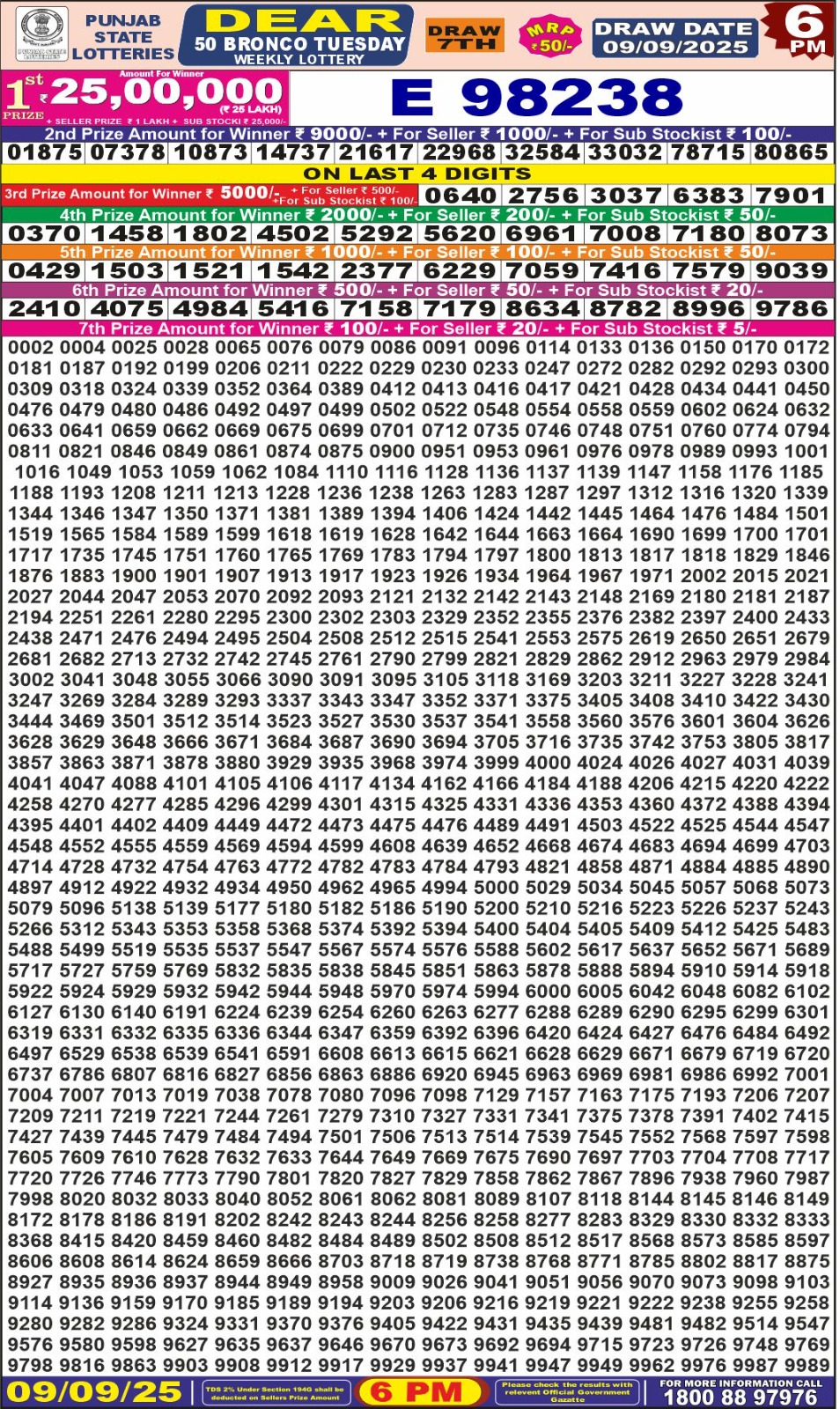 Punjab State Dear 50 Tuesday Weekly Lottery Result Today 09/09/25