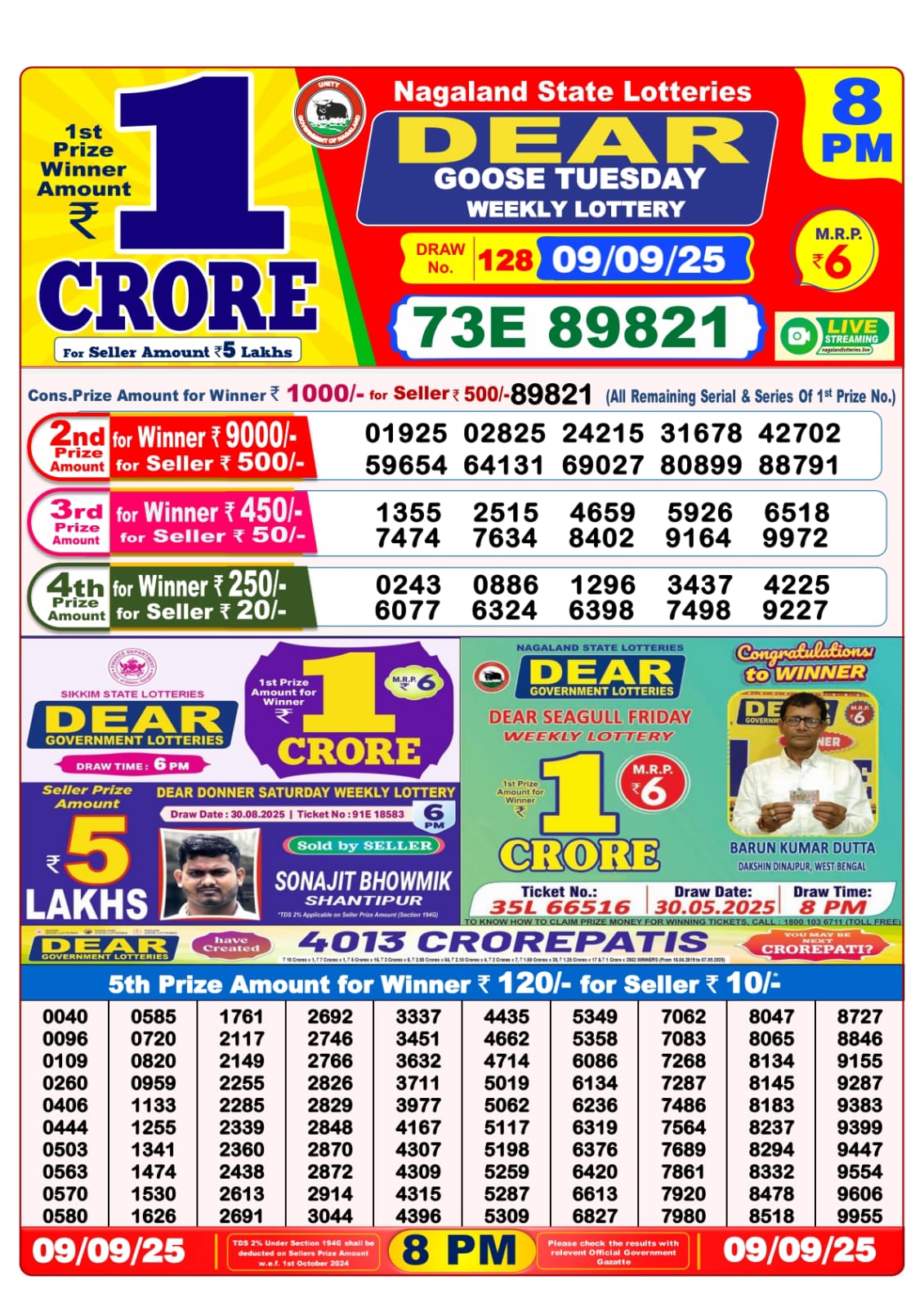 Dear Lottery Sambad 8:00 PM Result Live 09/09/25
