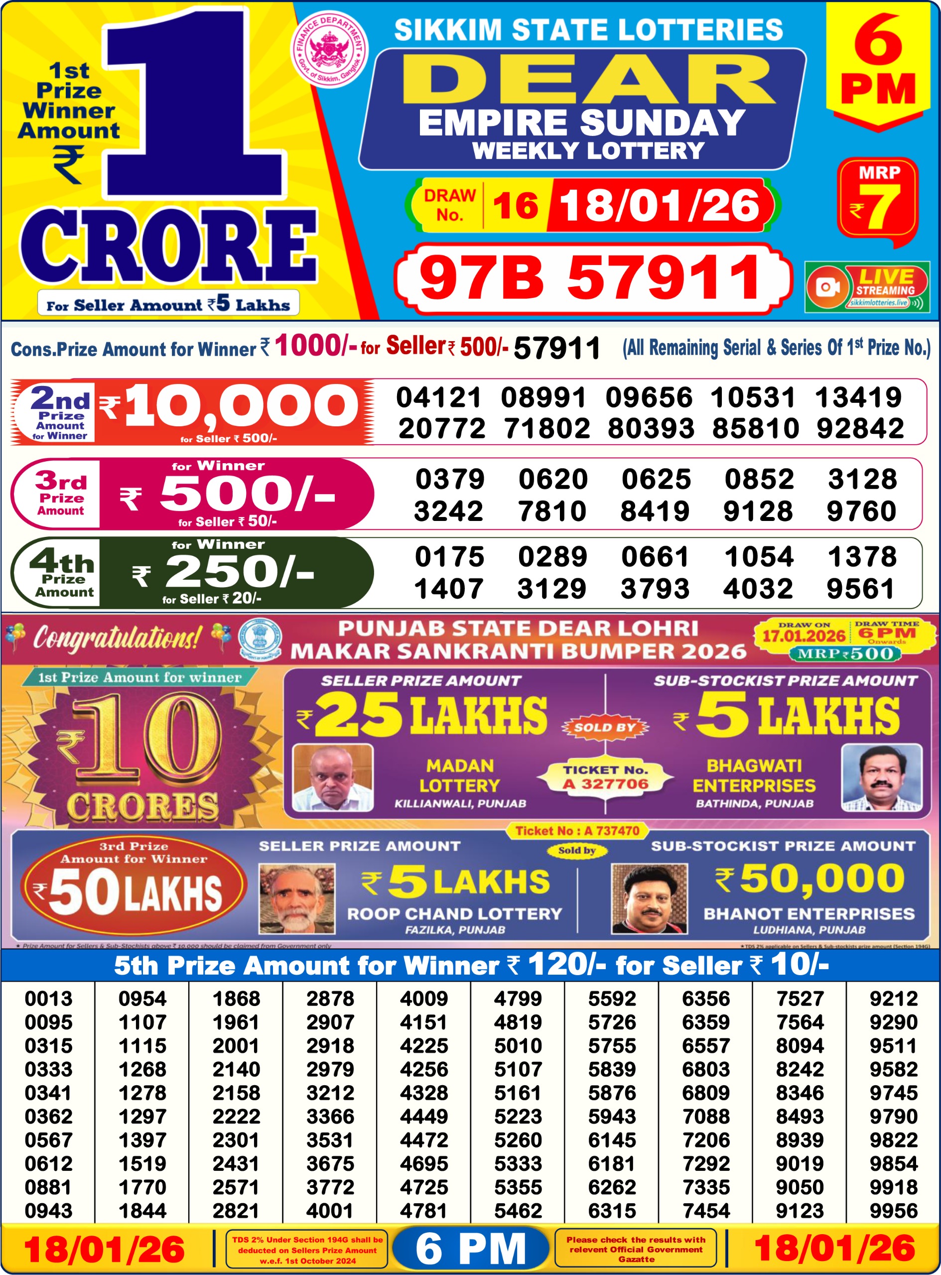 Dear Lottery 6 PM Result Today 18/01/2026