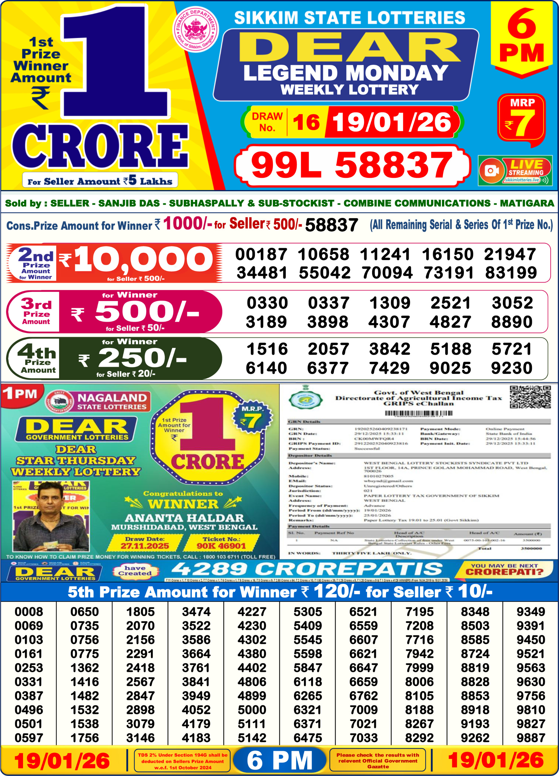 Dear Lottery 6 PM Result Today 19/01/2026