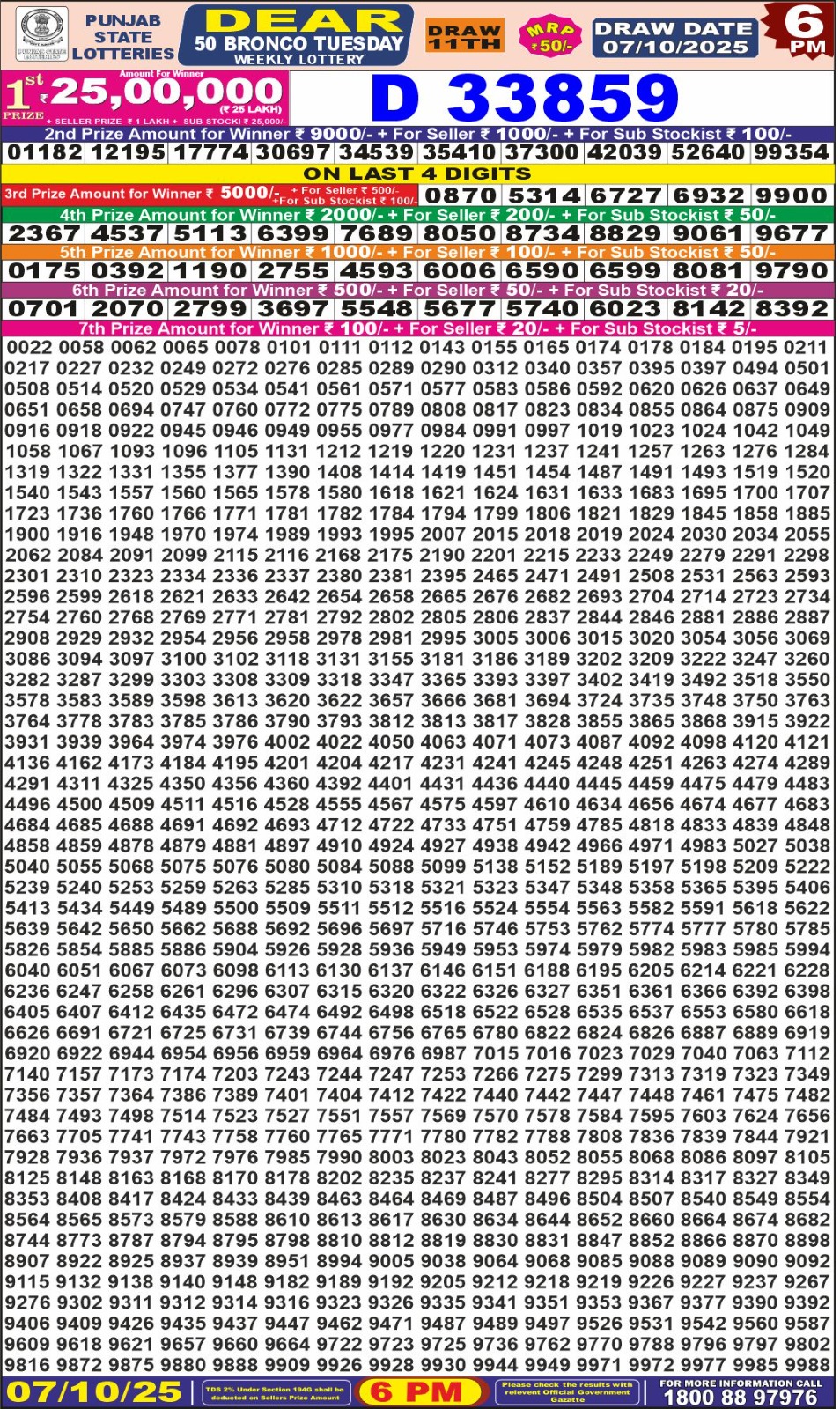Punjab State Dear 50 Tuesday Weekly Lottery Result Today 07/10/25