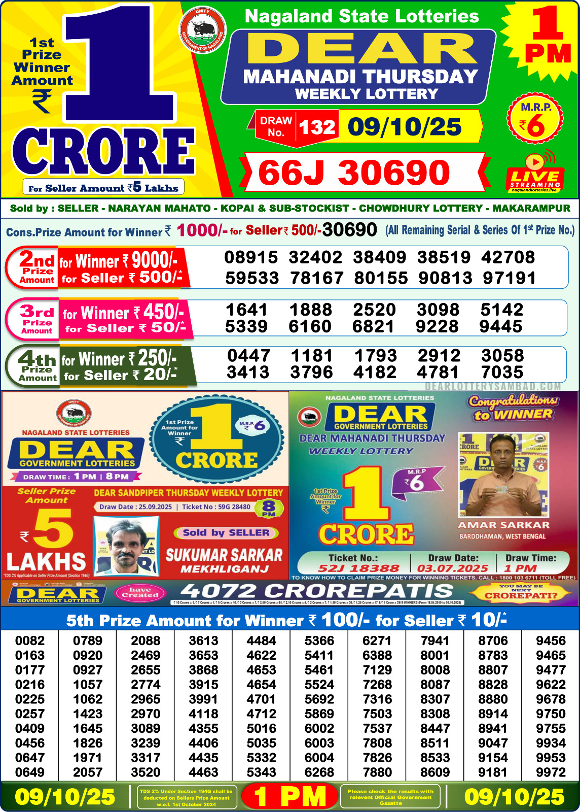 Dear Lottery Sambad 1:00 PM Result Live 09/10/25