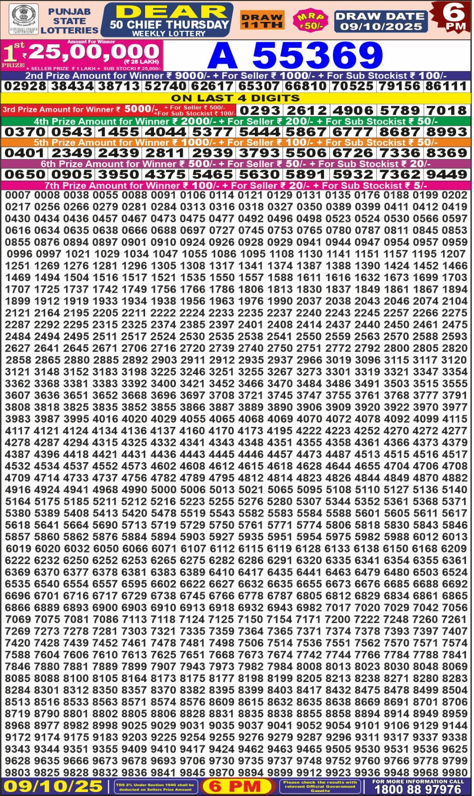 Punjab State Dear 50 Tuesday Weekly Lottery Result Today 09/10/25