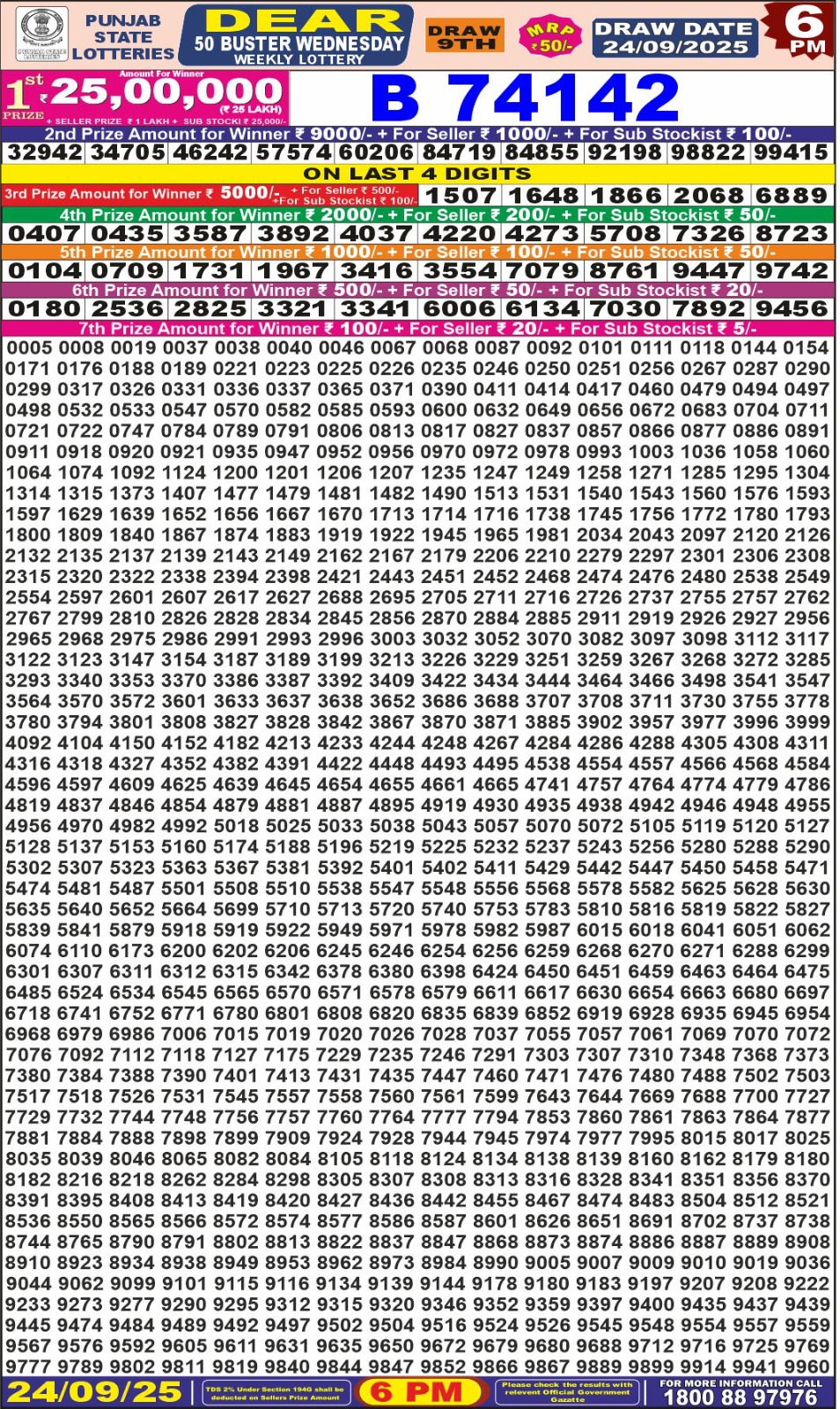 Punjab State Dear 50 Wednesday Weekly Lottery Result Today 24/09/25