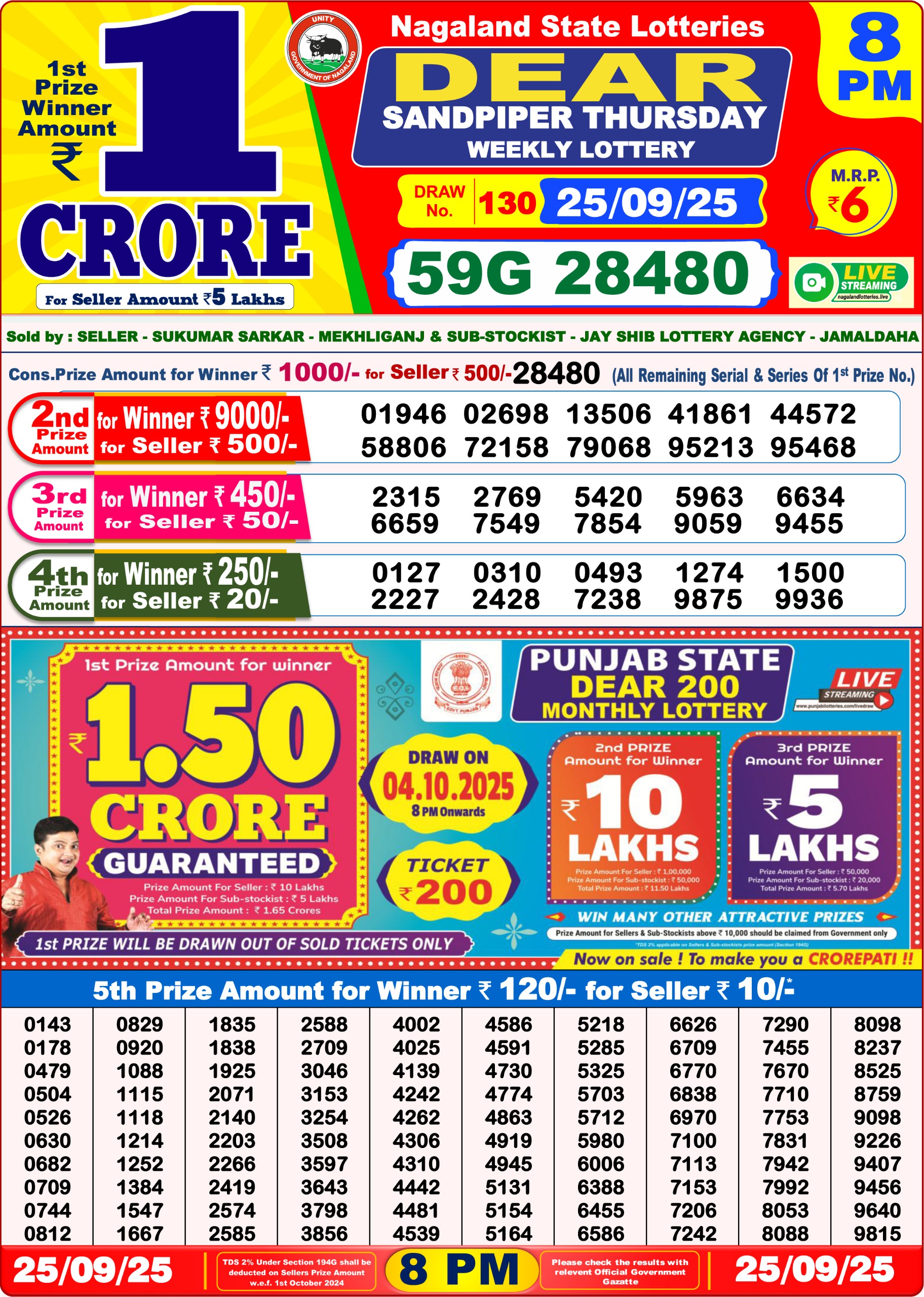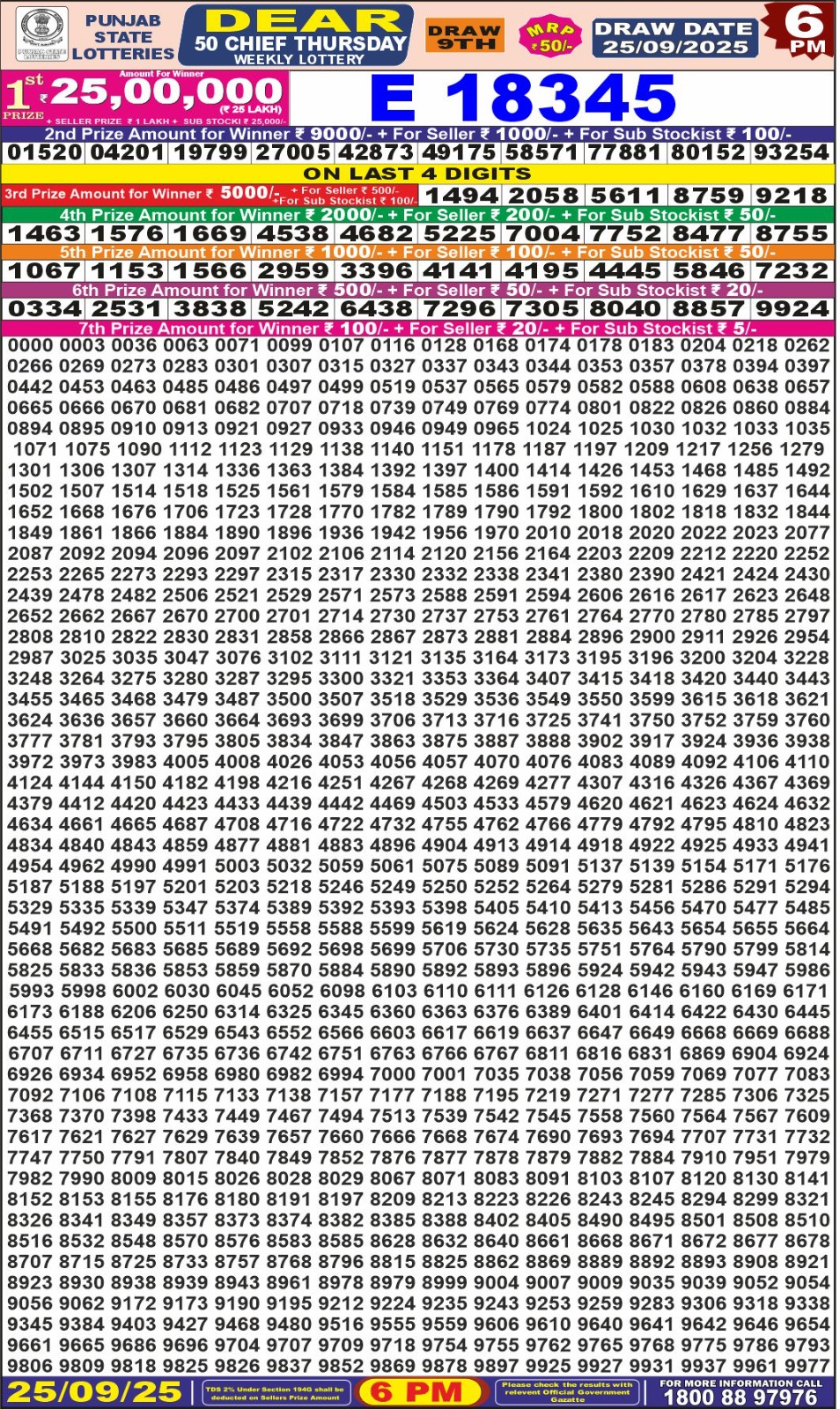 Punjab State Dear 50 Thursday Weekly Lottery Result Today 25/09/25