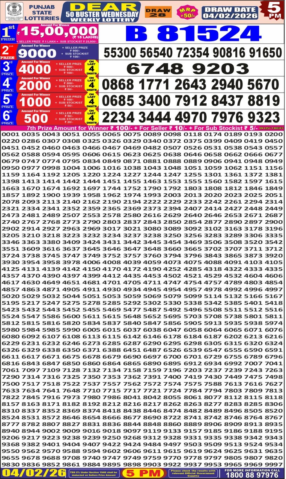 Punjab State Lottery Dear 50 Result 5PM 04/02/2026