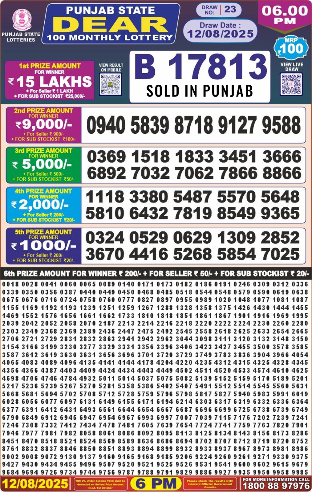 Punjab State Dear 100 Monthly Lottery Result 12.08.25 Live Leave a Comment on Punjab State Dear 100 Monthly Lottery Result 12.08.25 Live