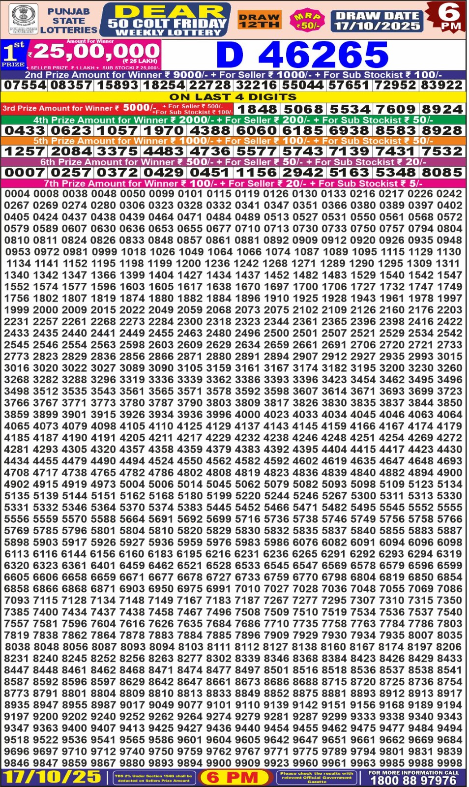 Punjab State Dear 50 Tuesday Weekly Lottery Result Today 18/10/25