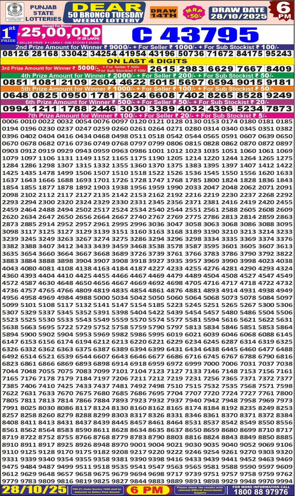 Punjab State Dear 50 Tuesday Weekly Lottery Result Today 28/10/25 Leave a Comment on Punjab State Dear 50 Tuesday Weekly Lottery Result Today 28/10/25 Posted in Punjab State 6 PM Lottery Result