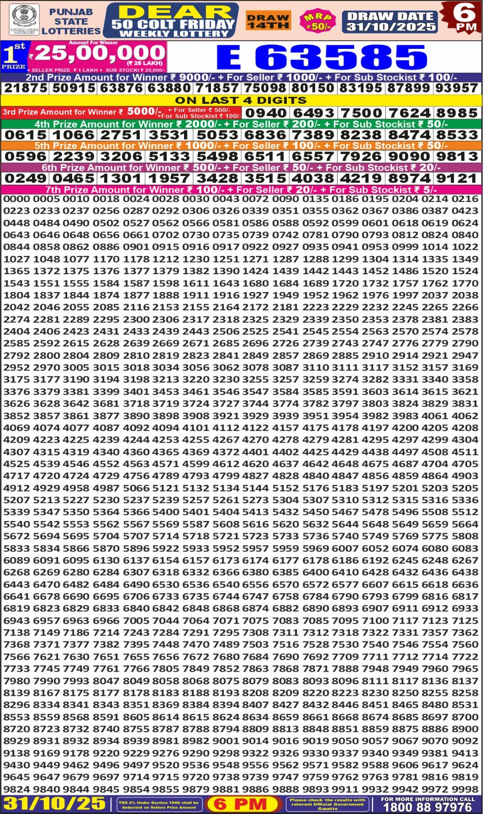 Punjab State Dear 50 Tuesday Weekly Lottery Result Today 31/10/25 Leave a Comment on Punjab State Dear 50 Tuesday Weekly Lottery Result Today 31/10/25 Posted in Punjab State 6 PM Lottery Result