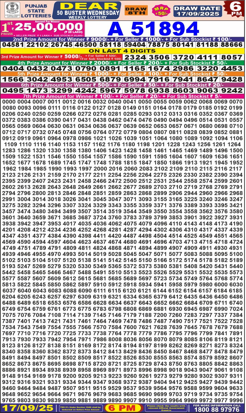 Punjab State Dear 50 Wednesday Weekly Lottery Result Today 17/09/25 Leave a Comment on Punjab State Dear 50 Wednesday Weekly Lottery Result Today 17/09/25