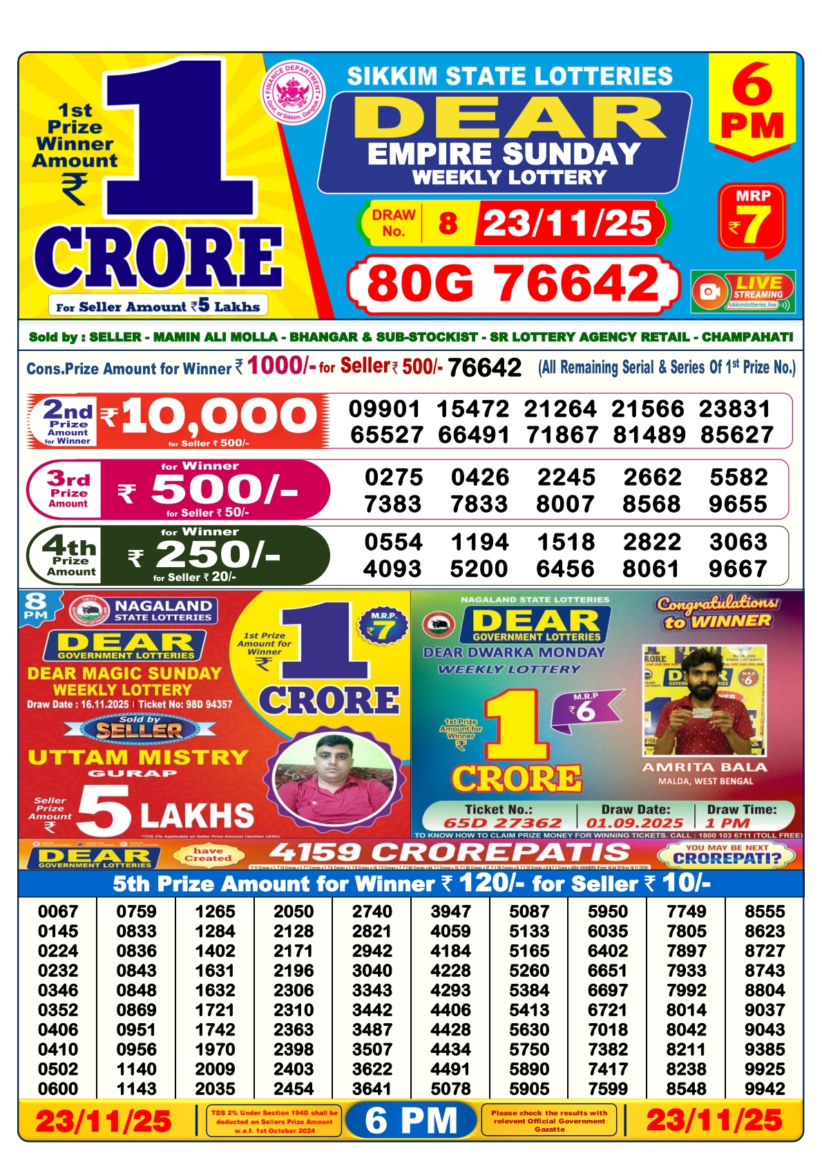 Dear Lottery Sambad 6 PM Result Today 23/11/2025 Sikkim State Lottery